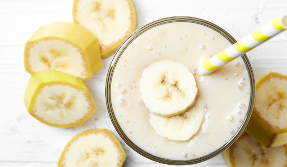 - Press the "smoothie" button on your Blendtec to combine all ingredients except for the ice. Or if you have a different blender, continue to blend until the big banana chunks are gone. The texture should be smooth.