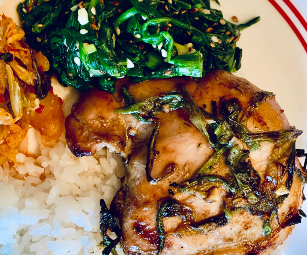 The Side Dishes really make this Chicken. Korean Spinach Salad is lite and fresh and super simple to make. A little goes a long way which is good because this salad uses cooked spinach and it cooks down so much. Meaning, you think you have a whole heap spinach and then you cook it and looks like you only have an 1/8 of the amount you started with.